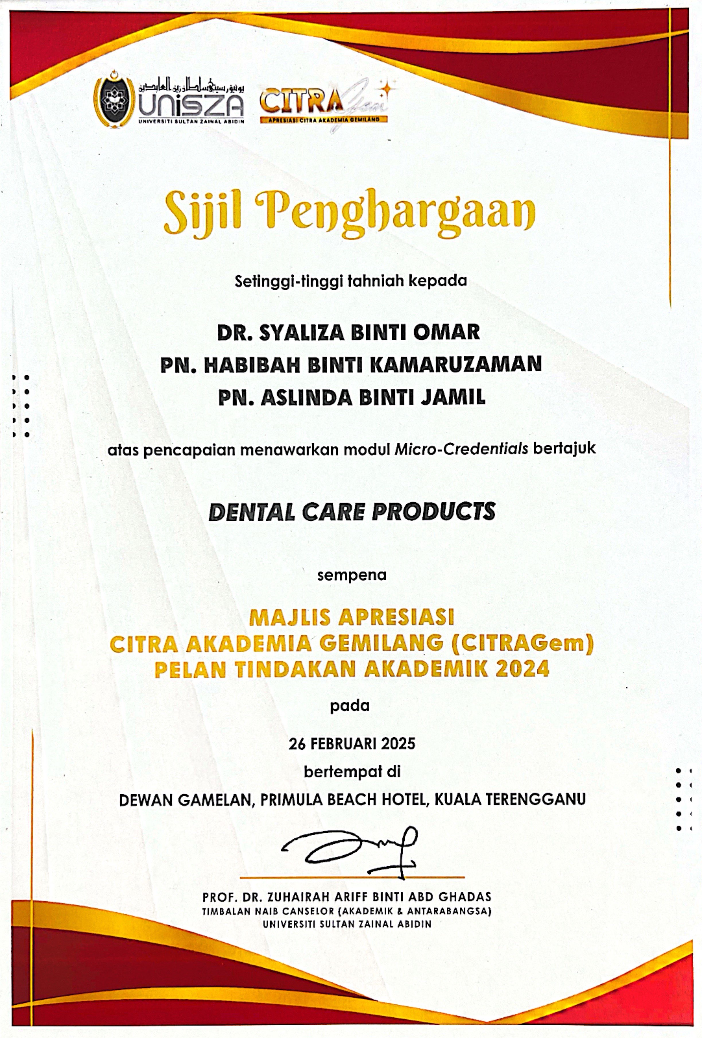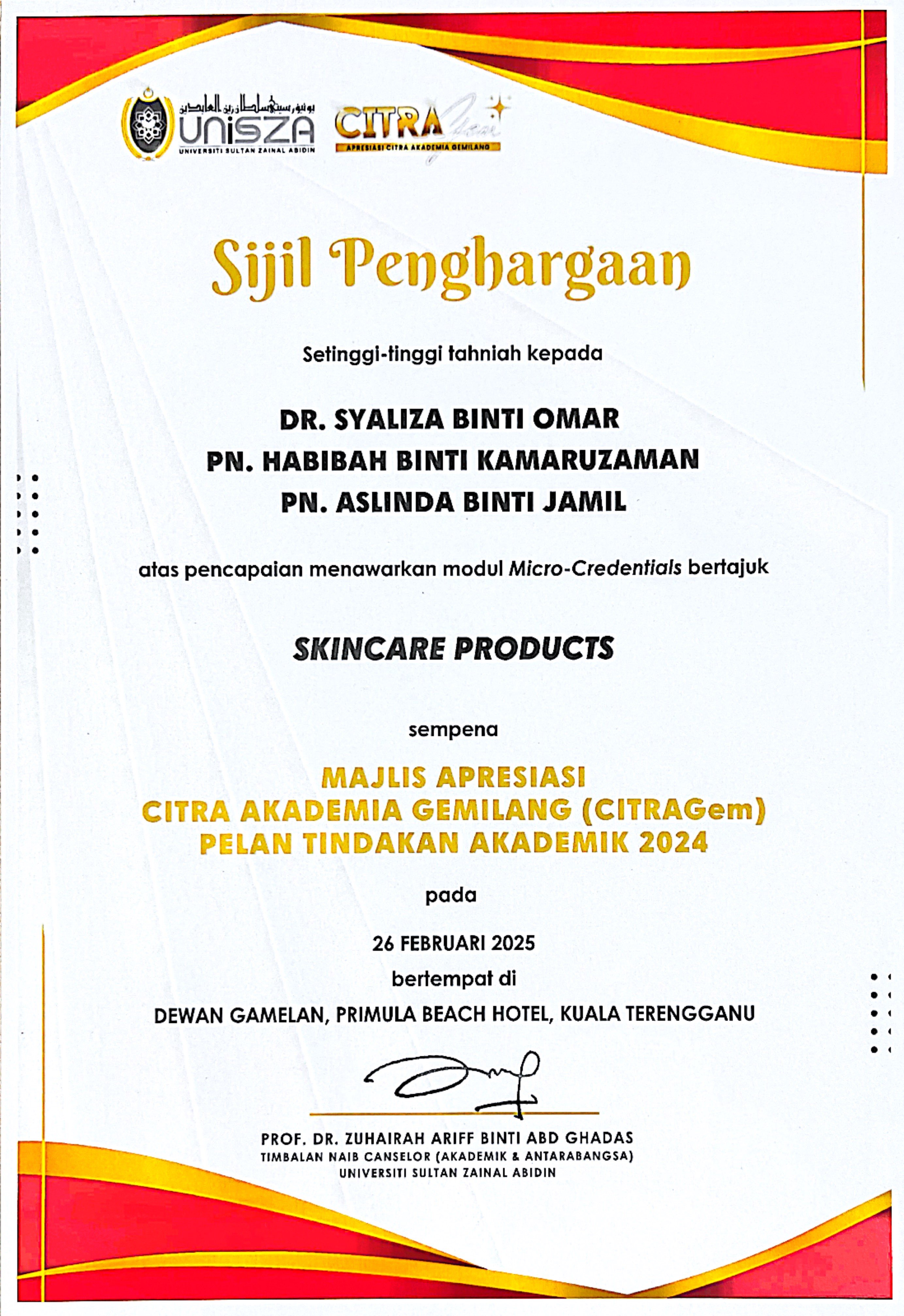 Pengiktirafan ( anugerah / jemputan ucap utama / seminar / penceramah jemputan / jurulatih utama / mentor ) yang diperolehi.