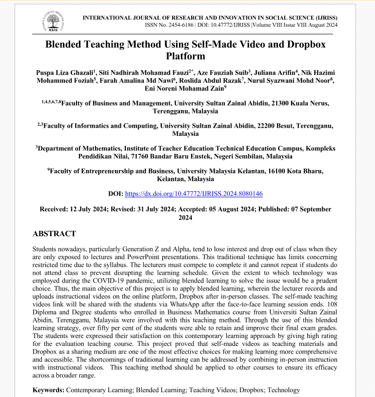 Dalam pengajaran, saya menggunakan video pengajaran buatan sendiri serta platform seperti bagi mewujudkan sesi yang lebih interaktif, dinamik dan imersif. Bagi penyeliaan pelajar pascasiswazah, saya membangunkan Research Milestone Matrix sebagai templat visual untuk membantu pelajar memantau kemajuan dan mengenal pasti cabaran secara sistematik. Penyeliaan dijalankan secara hibrid, di mana pelajar menghantar draf melalui shared document untuk semakan dan maklum balas masa nyata, sekali gus meningkatkan kecekapan dan keberkesanan bimbingan.